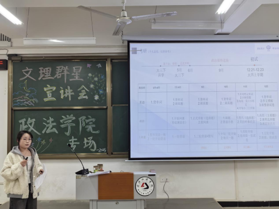 第四环节,由宣讲人周雨嫣来分享自己考研的心得:她首先告诉同学们对待专业学习要始终保持着一颗热忱的心,始终严格要求自己,明确自己的学习目标与奋斗方向。然后,她围绕着她在团学工作期间所做出的突出贡献向同学们进行了分享;在分享考研经验时,她为同学们梳理了考研相关信息,提醒同学们在备考时一定要明确所考专业和公司,并查看往年的参考书目,了解考试大纲,她着重提醒我们一定要对自己的目标明确并为此做出行动和规划。