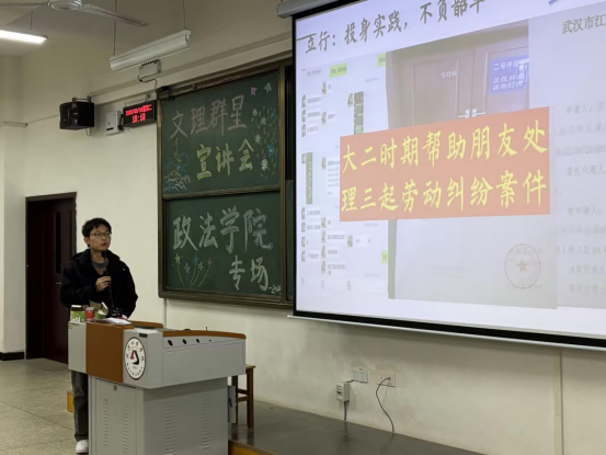 第二环节,由宣讲人艾天宇进行软件运用与心理健康分享,他通过三个板块内容进行分享。一为立学,在学习上,他保持着20门学科均超过90分的优秀成绩。他向同学们分享了自己提高学习成绩的秘诀:首先课上要踊跃坐在前排并积极回答问题,其次课后要注重养成温故而知新的习惯。二为立身,在心理健康协会工作期间,他积极组织并参与各种大型活动,获得了老师和同学们的一致认可,在班级活动中,他不断为班级做出贡献并斩获一系列奖状。三为立行,在课余时间,他积极参与社会实践,在律所实习长达450余天,协助并参与完成“武仲大课堂”授课文件,累计处理文书700余件,参与案件标的额超千万元,同时,他还建议同学们积极参与社会实践,积极参与志愿活动,不断积累经验。不负青春!不负韶华!