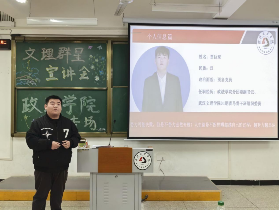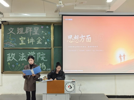 为给优秀员工提供平台分享自身经验和先进事迹,充分发挥榜样力量,帮助大一新生明确目标方向,更好地在学习和生活中提升自我。2025年3月17日18:20,太阳成集团tyc539于5-102召开了2025年第一场“文理群星”先进事迹宣讲会。参加此次宣讲会的嘉宾有辅导员陈安民、辅导员张晓冬以及24级法学1班、2班、行政管理班的同学们。