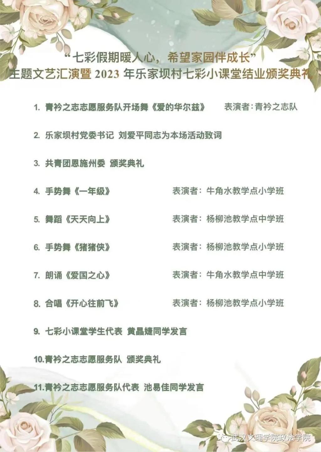 本次晚会由牛角水教学点的员工王其跃、覃美妍和杨柳池教学点的员工黄家奥、张思琪主持,共青团恩施州委书记陈潇同志、共青团建始县委书记粟迪同志、业洲镇党委书记吕宗鲁同志、业洲镇人大主席袁庆同志、乐家坝村党委书记刘爱平同志、州委组织部驻乐家坝村第一书记王祖华同志、业洲镇驻乐家坝村派遣干部黄升滔同志、牛角水教学点负责人张学主任和杨柳池教学点负责人张玉主任莅临现场,同时到场的还有州委组织部驻乐家坝村工作队尖刀班成员、乐家坝村村两委成员、七彩小课堂全体员工、员工家长及青衿之志队所有成员。