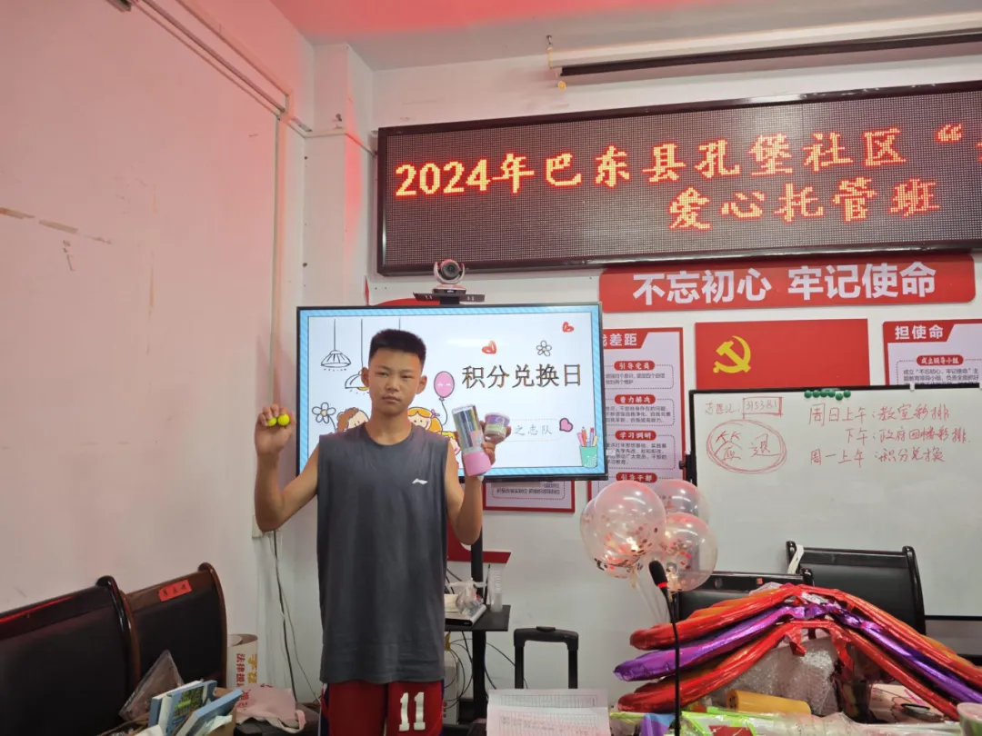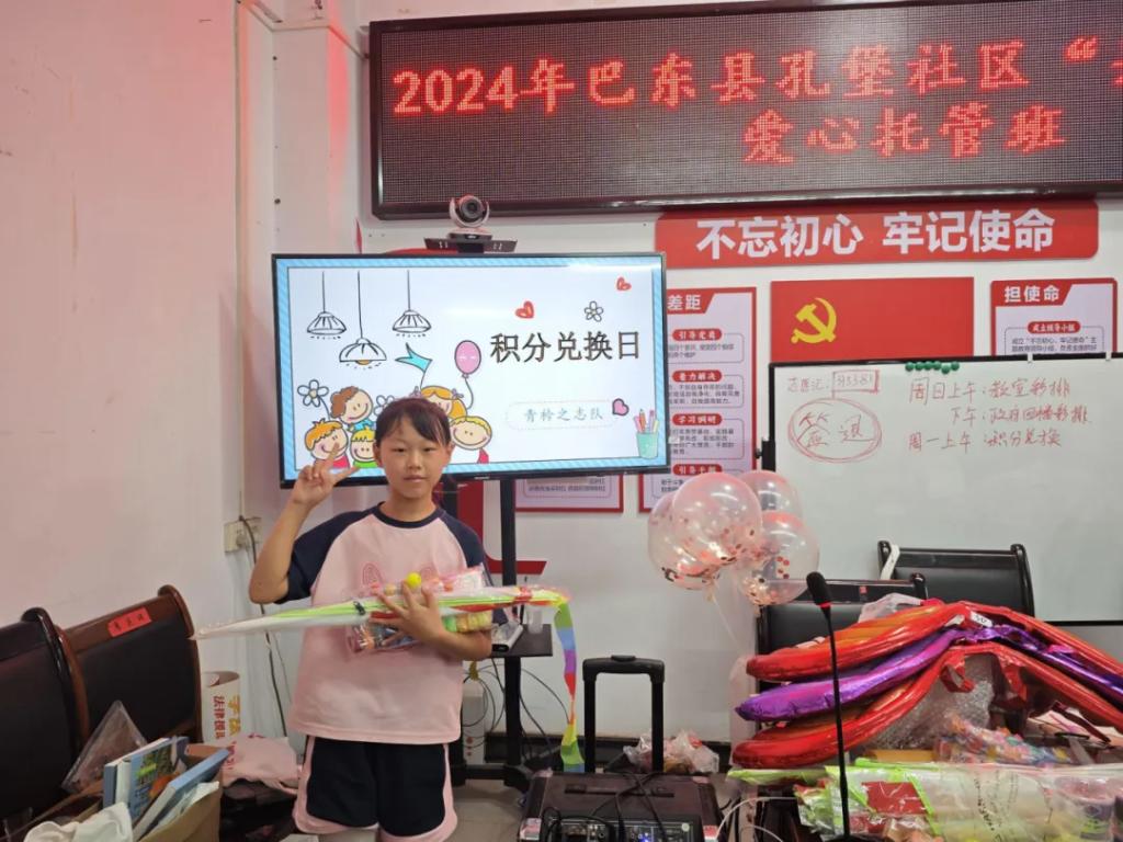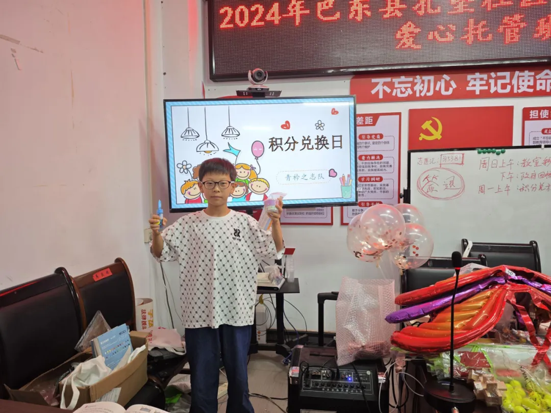 2024年7月29日,青衿之志志愿服务队为沿渡河镇暑期学堂的小朋友们开展了一场积分兑换活动。航天积木、水彩笔、小花盆、蝴蝶气球……桌子上堆满了可以用积分兑换的小礼物,小朋友们按照积分高低,分别兑换着自己喜欢的礼物,露出了开心的脸庞。