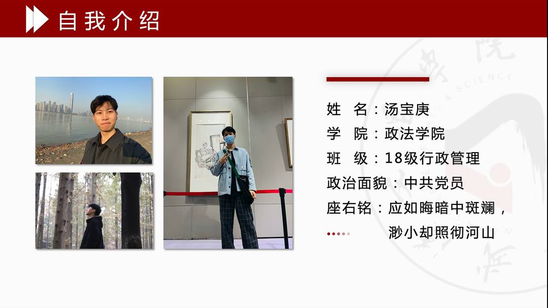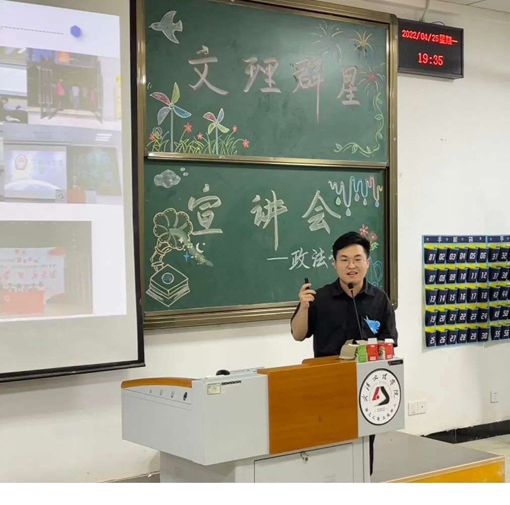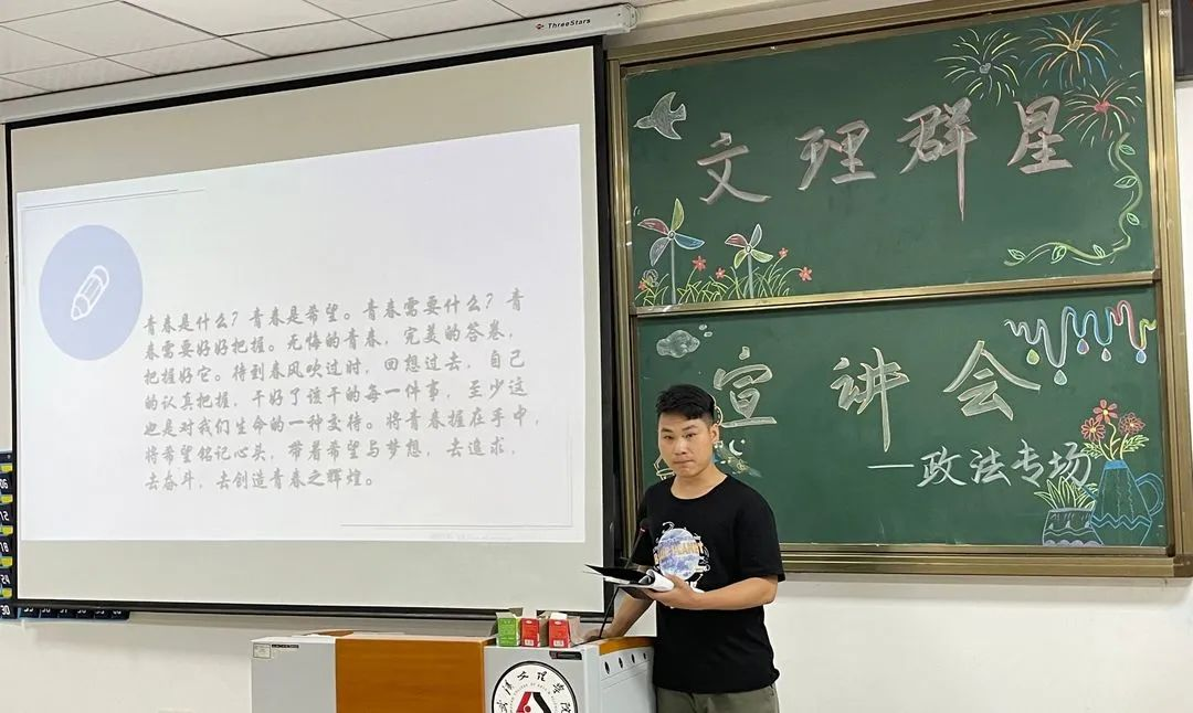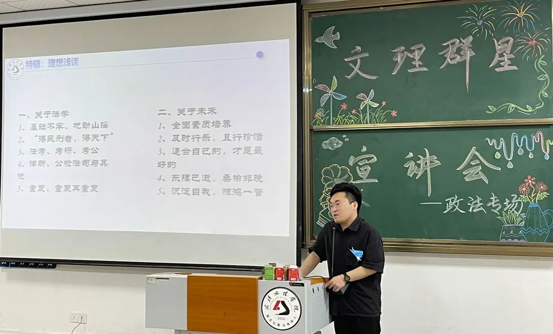 宣讲内容:袁宇学长告诉我们“将学习变成一种兴趣”,兴趣能一直陪伴我们,那学习就能如影随形,同时,团学也是老员工活中重要的一部分,能展示自己提升自己。我们要做好未来规划,选择适合自己的考公考研道路,并推荐出适合法学的精彩书籍。“扎根”是学长留给我们的思考。