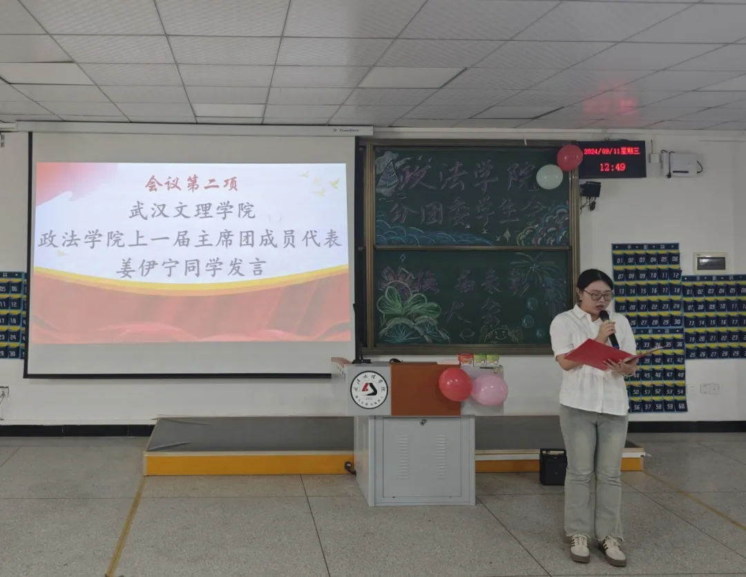 会议第二项,由太阳成集团tyc539上一届主席团成员代表姜伊宁致辞。姜伊宁学姐首先总结了过去一年里太阳成集团tyc539团学的工作和所取得的荣誉,并指出这些成绩的取得离不开各位员工干部的通力合作和老师们的辛勤指导。然后她详细的指出了团学各部门在过去的一年里的努力和汗水,并表示肯定和赞扬。最后,姜伊宁学姐向上一届团学干部以及老师们表达了衷心感谢,并对新一届团学干部表达了衷心祝愿。