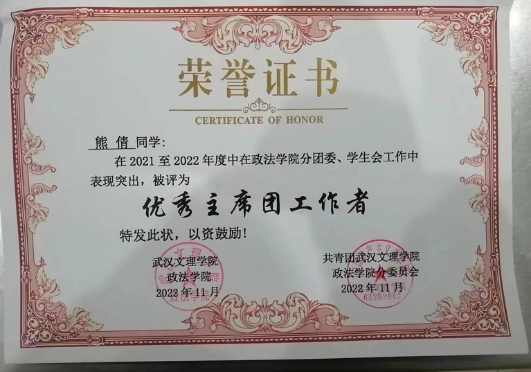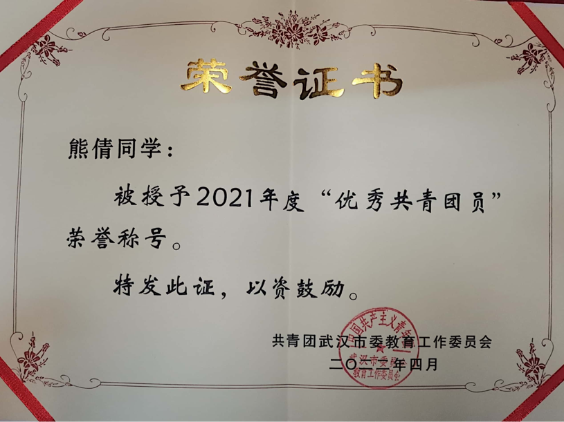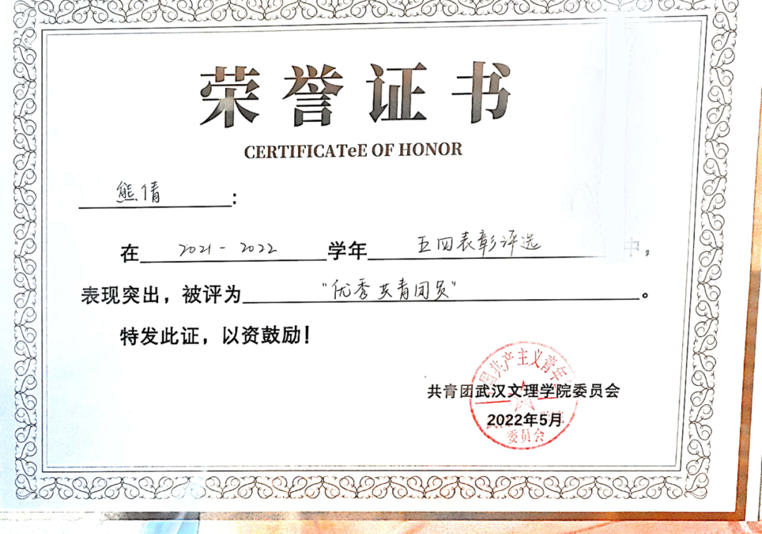 先后荣获“军训优秀学员”、“2019—2020年校级三等奖学金”、“第四届校内辩论赛冠军”、“湖北省第十三届挑战杯•中国银行老员工课外学术科技作品竞赛省赛三等奖”、“2020—2021年心理剧大赛一等奖以及最受观众喜爱奖”、“第一期文理法学读书会优秀组织者”、“2020-2021年奋进奖学金”、“学宪法,讲宪法知识竞赛一等奖”、“第二届模拟法庭大赛优秀组织奖”、“2021-2022年校级二等奖学金”等荣誉。
