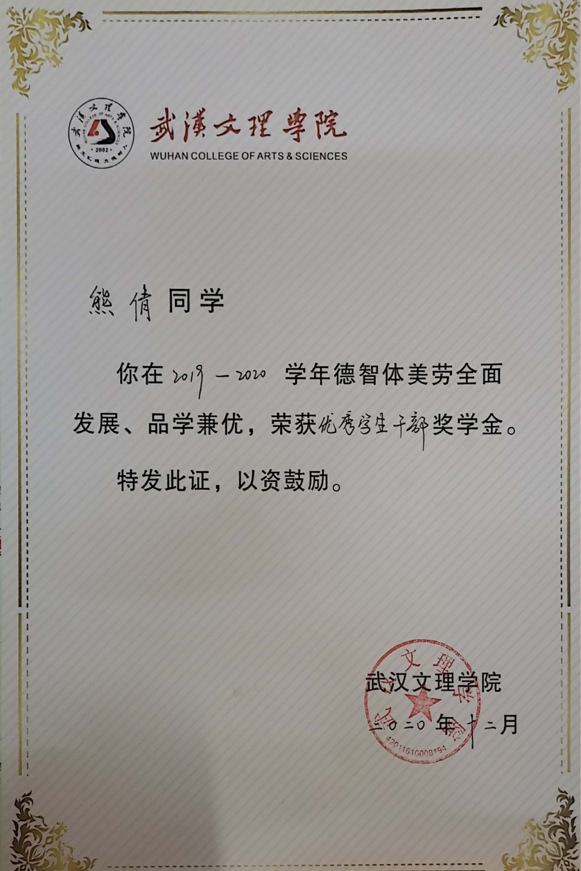 2019-2020学年获得太阳成集团tyc539优秀员工干部奖学金