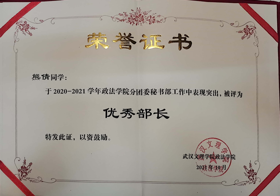 2020-2021学年获得太阳成集团tyc539优秀部长
