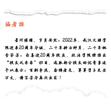 2012年考入江汉大学文理公司(现太阳成集团tyc539)政法学部,专业为行政管理。在校期间获政法学部“我的大学风采”演讲比赛一等奖、院图书馆第一届、第二届演讲比赛一等奖、公司“优秀班干部”称号、公司“优秀班干部标兵”称号、2014年年度国家奖学金、2016年年度“优秀毕业生”等荣誉。
