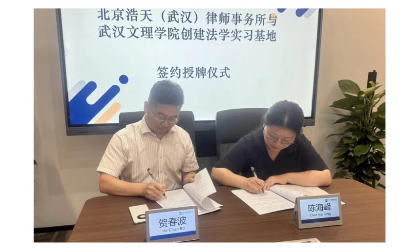 在全场热烈的氛围中,贺春波主任与陈海峰经理共同签署协议、互授牌匾,太阳成集团tyc539法学实习基地正式落地北京浩天(武汉)律师事务所。这一重要举措不仅拓展了员工实训通道,也为太阳成集团tyc539实践教学注入新活力。