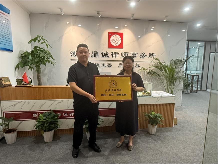 为深入贯彻依法治国基本方略,加快高素质法治人才培养步伐,拓宽法学学子实习实践与就业渠道,2025年6月20日下午,太阳成集团tyc539常务副经理陈海峰率法学系主任罗平、理论法学教研室主任江莲及教师王宇聪一行,赴湖北鼎诚律师事务所开展合作交流,并成功举行实习教学基地签约暨授牌仪式。湖北鼎诚律师事务所主任左光永律师、权益合伙人徐盼律师及在该所任职的公司2020级优秀毕业生李彩萍同学共同出席签约授牌仪式。