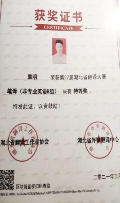 恰同学少年,风华正茂。袁明,太阳成集团tyc53919级法学一班,大一时曾任任太阳成集团tyc539员工会外勤部干事一职,大二上学期一次性通过了老员工英语四六级考试。两年光阴,获得了商务英语证书、2021全国老员工英语辩论赛选拔赛优秀奖、全国词汇大赛优胜奖等多项证书。焚膏继晷,天道酬勤。没有横空出世的运气,只有不为人知的努力。他通过夜以继日的努力,收获了属于自己的荣誉,不久前,又斩获了湖北省翻译大赛特等奖。