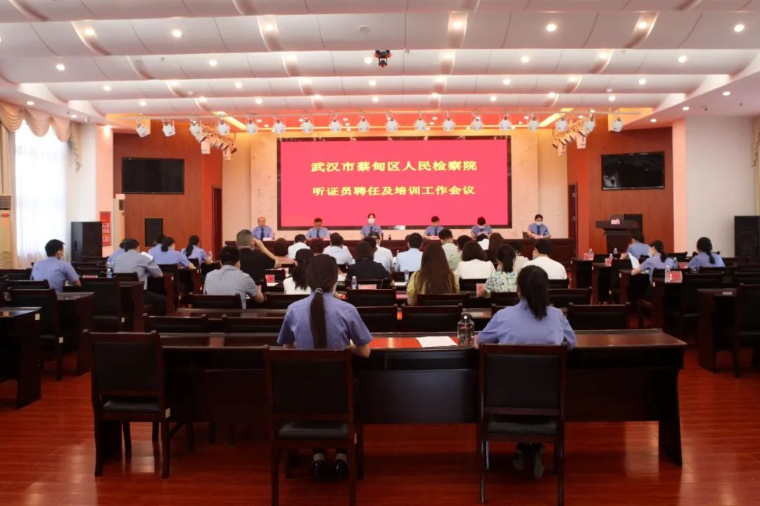 2022年6月17日,武汉市蔡甸区人民检察院举办首届听证员聘任大会,为第一批听证员颁发聘书,并纳入检察听证员库。武汉市人民检察院案件管理办公室主任王琼、三级高级检察官许兵受邀出席。蔡甸区人民检察公司党组书记、检察长罗永鑫出席会议并讲话,党组成员、副检察长李书乔主持会议,党组副书记、副检察长陈邦华、党组成员、政治部主任郑君、各部门负责人、检察官参加会议。