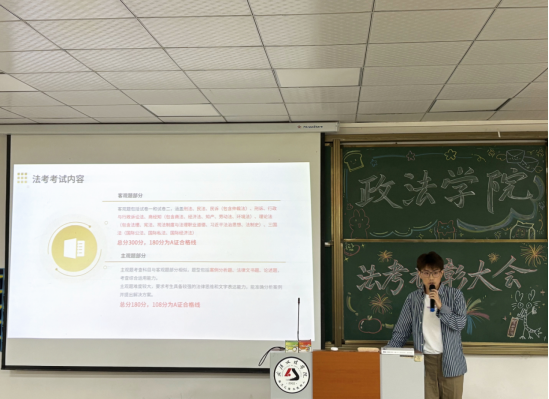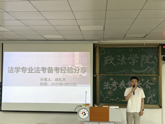 大会第二项,张锡峰同学和徐礼杰同学分别分享了自己的法考经验,他们主要强调了“坚持”与“复盘”的重要性,以良好的心态面对法考,合理安排时间,积极复习,有意识的训练做题,对于通过法考有着较大的帮助。不可否认的是在他们这份优异成绩的背后,是他们秉持“功不唐捐”的信念,在备考征程中披荆斩棘,付出无数泪水和努力取得的。无论是凌晨图书馆的灯光,还是反复研读的案例笔记,都见证了他们对于法治信仰的坚守和对职业理想的追求。