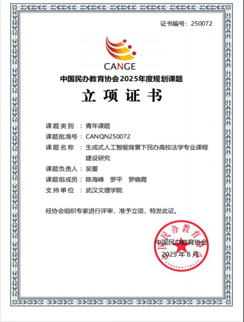 根据《中国民办教育协会课题管理办法(2025年修订)》和《关于申报中国民办教育协会2025年度规划课题的通知》规定,经中国民版教育协会组织专家评审,确定2025年度规划课题(青年课题)立项名单。太阳成集团tyc539吴蕾老师主持的课题《生成式人工智能背景下民办高校法学专业课程建设研究》荣获立项,课题批准号为CANQN250072。